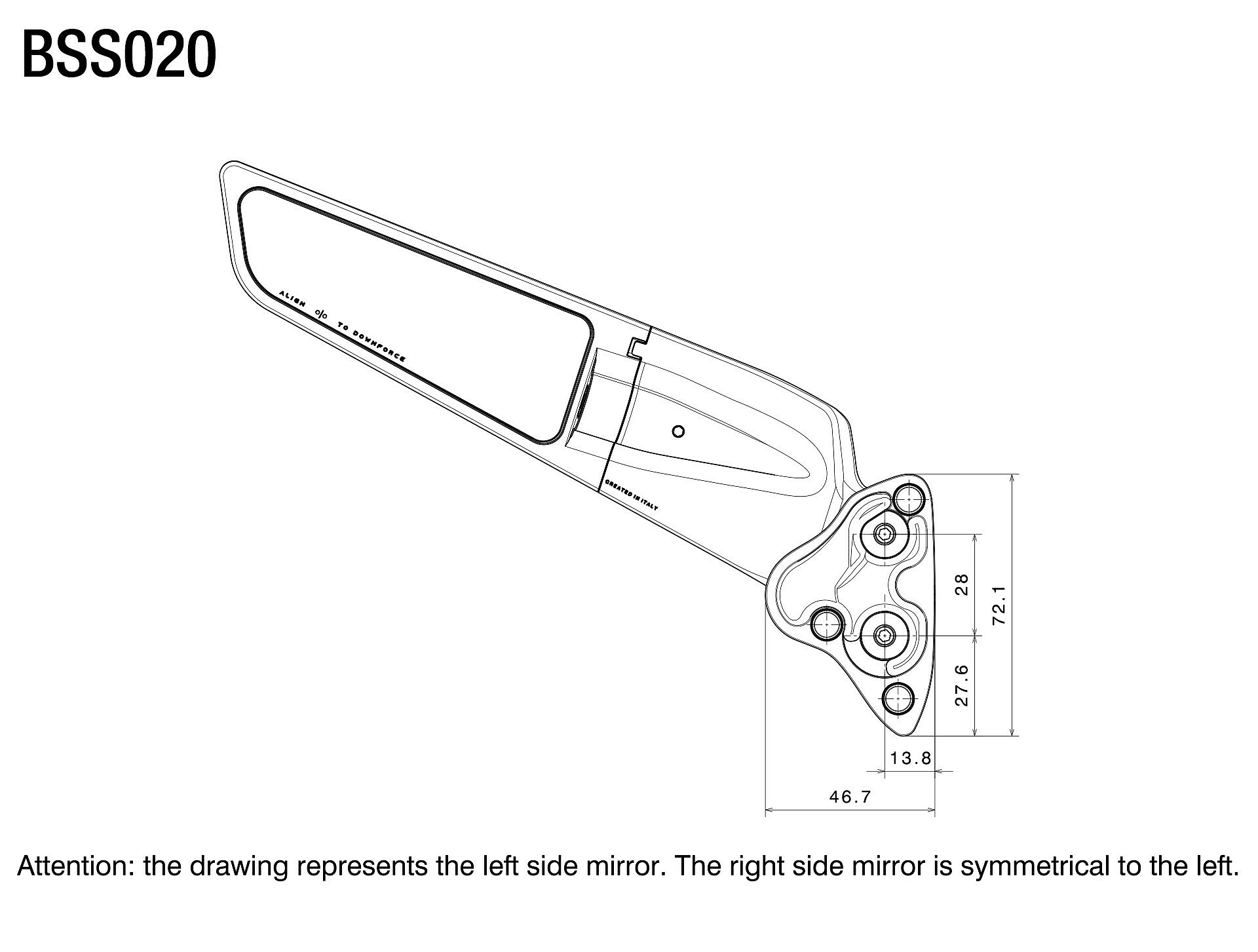 Two elements: a fixed base integrated into the fairing and a movable body that houses the glass. With a single motion, the structure compacts, transforming the mirror into an aerodynamic wing. The result: tangible downforce, up to 4 kg at 300 km/h. Milled from a single block of aluminum and finished with deep anodization, it features a convex HD blue-tinted lens for a sharp, glare-free view.