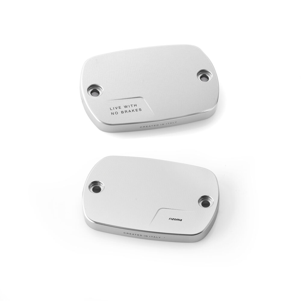 El diseño de las tapas de depósito de fluido de freno Rizoma, en aluminio mecanizado...