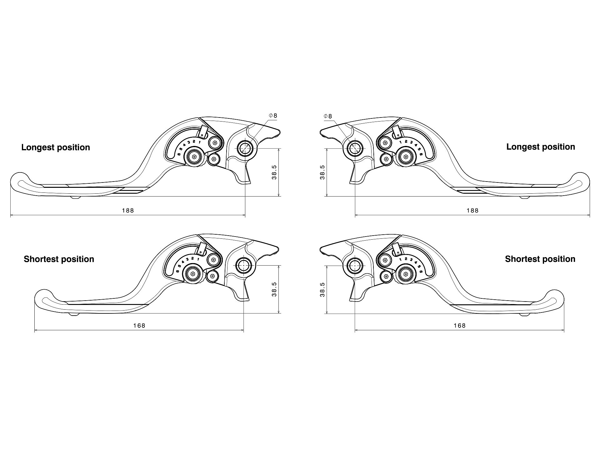 El kit de la palanca de freno incluye tanto la palanca del freno delantero como la palanca del freno trasero. Ambas palancas son Ajustables Plus: además del sistema de control de distancia palanca-perilla, colocado arriba para una mayor accesibilidad, también tienen un sistema deslizante que permite el ajuste de longitud de la propia palanca. Además, el kit incluye dos insertos de tecnopolímero que se utilizarán para eliminar el espacio que se crea cuando la palanca está en su máxima extensión (hasta 20 mm), evitando así el desgaste de los guantes.