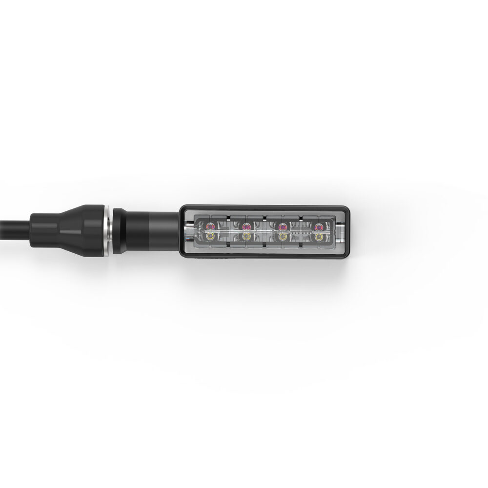 Son corps en aluminium moulé exprime la pureté de la forme, tandis que la technologie LED SMD réunit trois fonctions en un seul élément : clignotant séquentiel, position et stop.