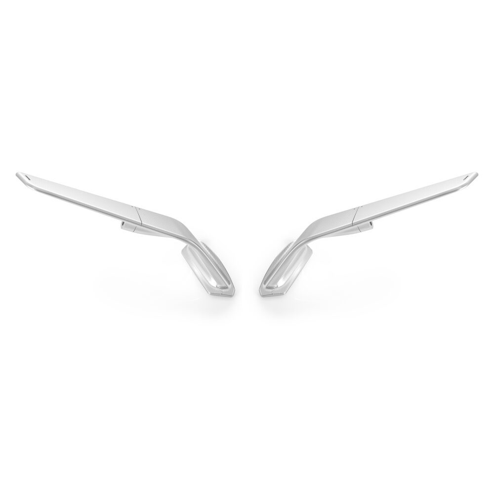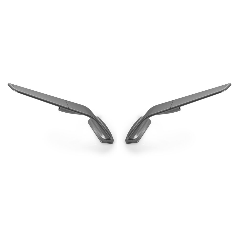 Deux éléments: une base fixe intégrée au carénage et un corps mobile qui protège la vitre. D’un seul geste, l’architecture se compacte, transformant le rétroviseur en une aile aérodynamique. Le résultat: une portance tangible, jusqu'à 4 kg à 300 km/h. Usiné à partir d’un seul bloc d’aluminium et fini avec une anodisation profonde, il est doté d’une lentille convexe HD teintée en bleu, offrant une vision nette et sans reflets.
