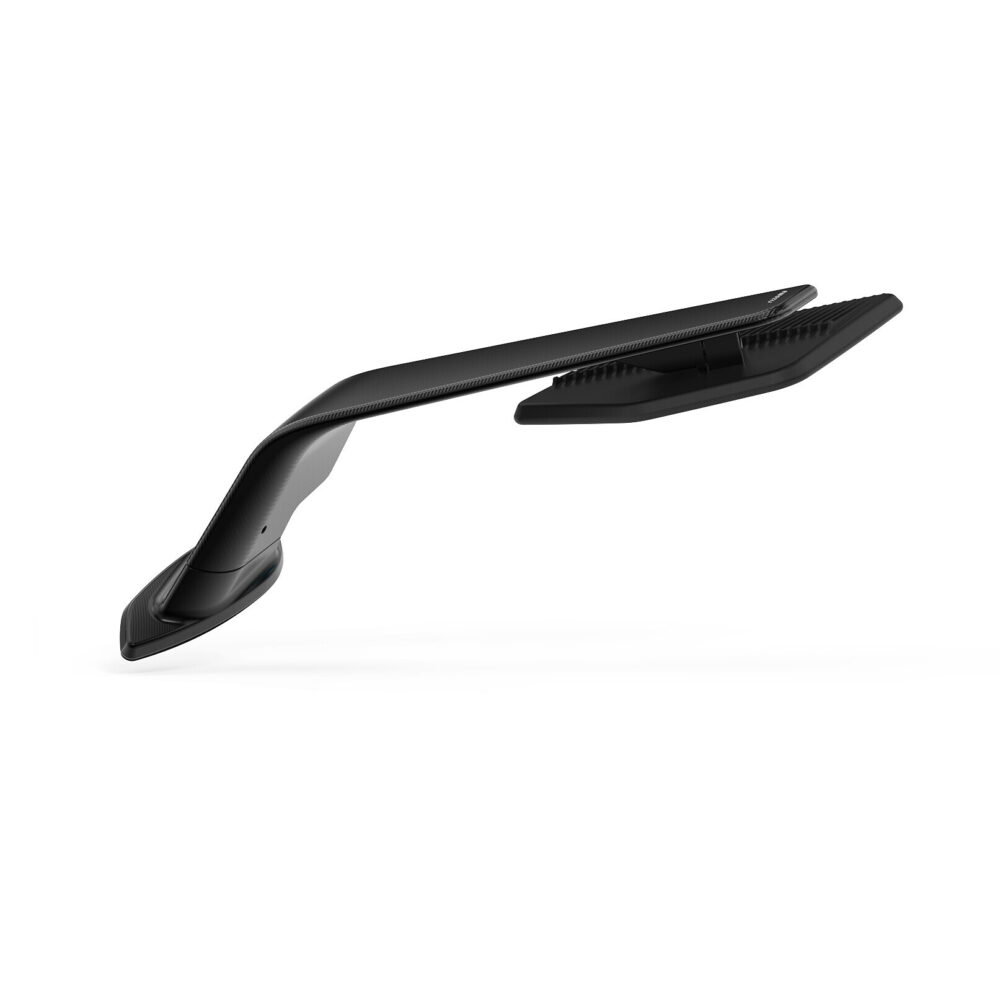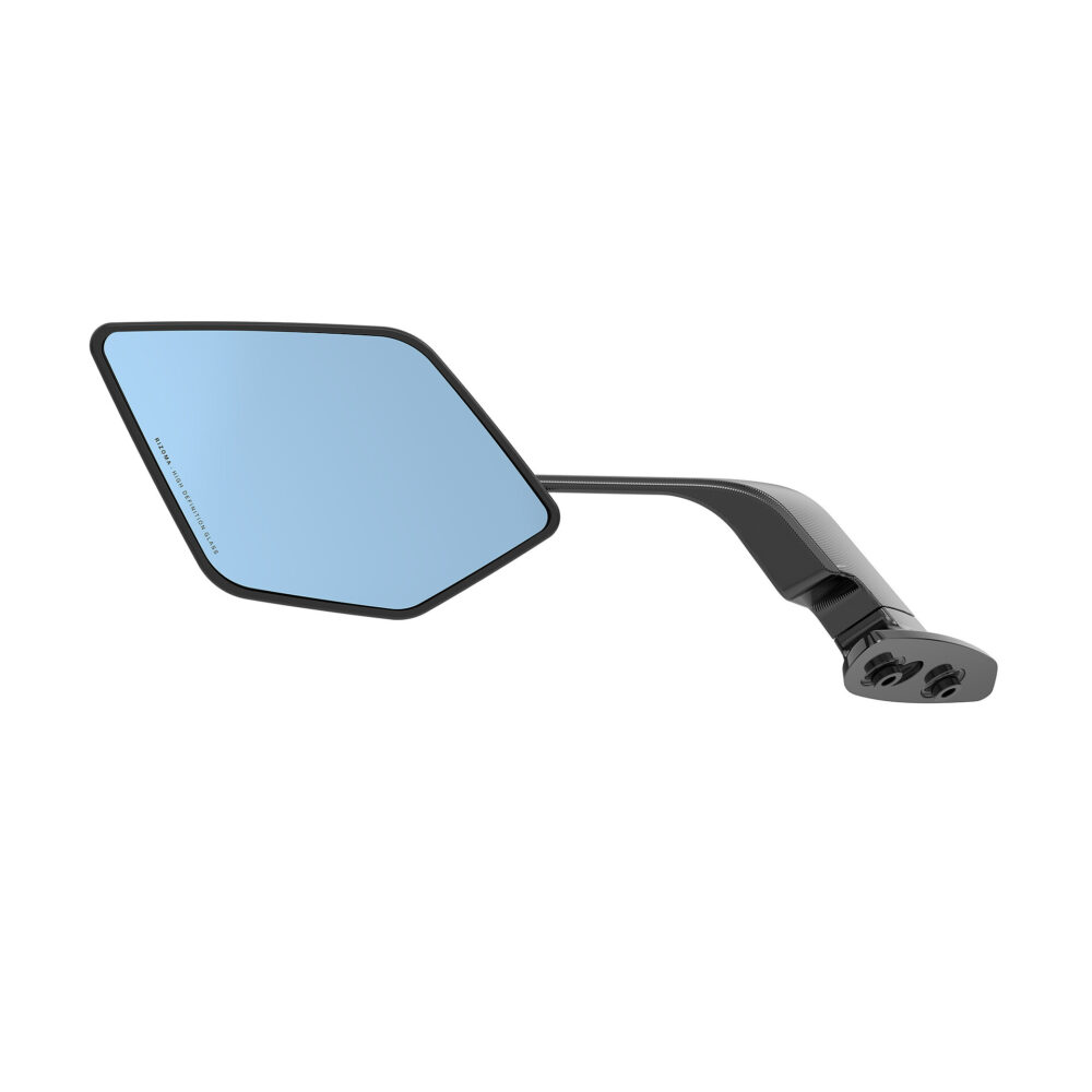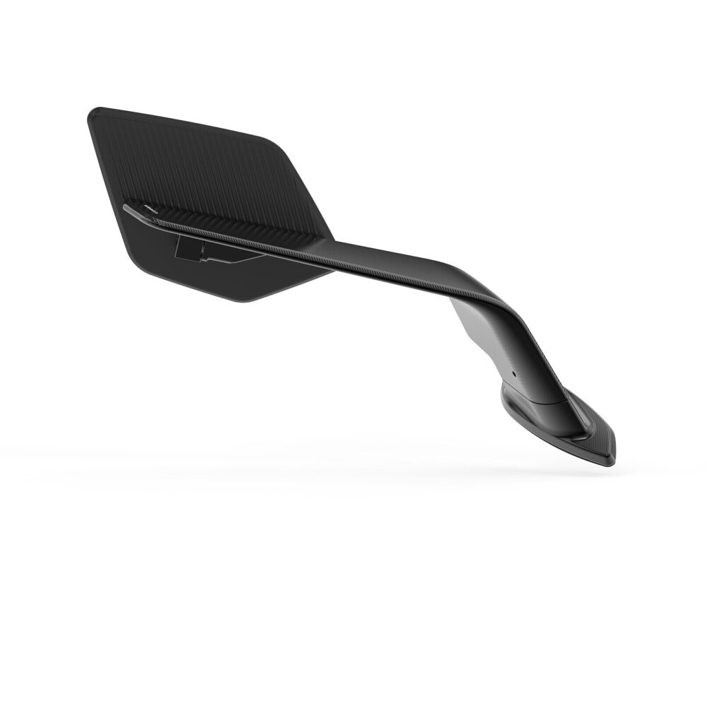 Corps en aluminium usiné dans la masse et anodisé, support de miroir en technopolymère avec une texture spécialement étudiée pour améliorer les performances aérodynamiques.